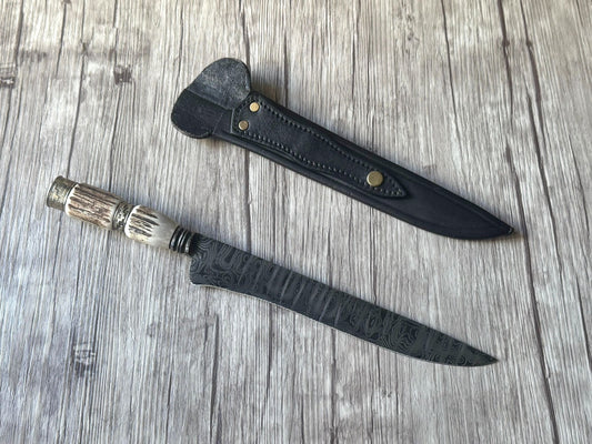 Damascus Knife, 10", Damascus Steel Blade, Deer Antler Handle, 370mm, DS10-056